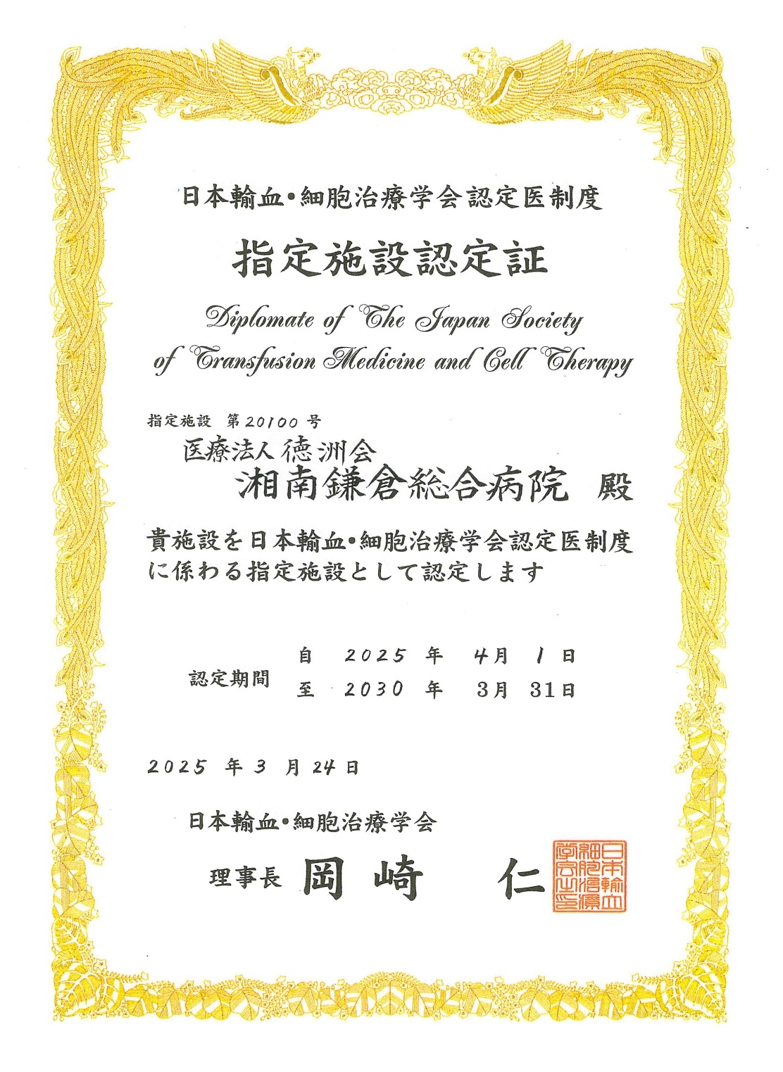当院は、日本輸血・細胞治療学会認定医制度に係わる指定施設です。