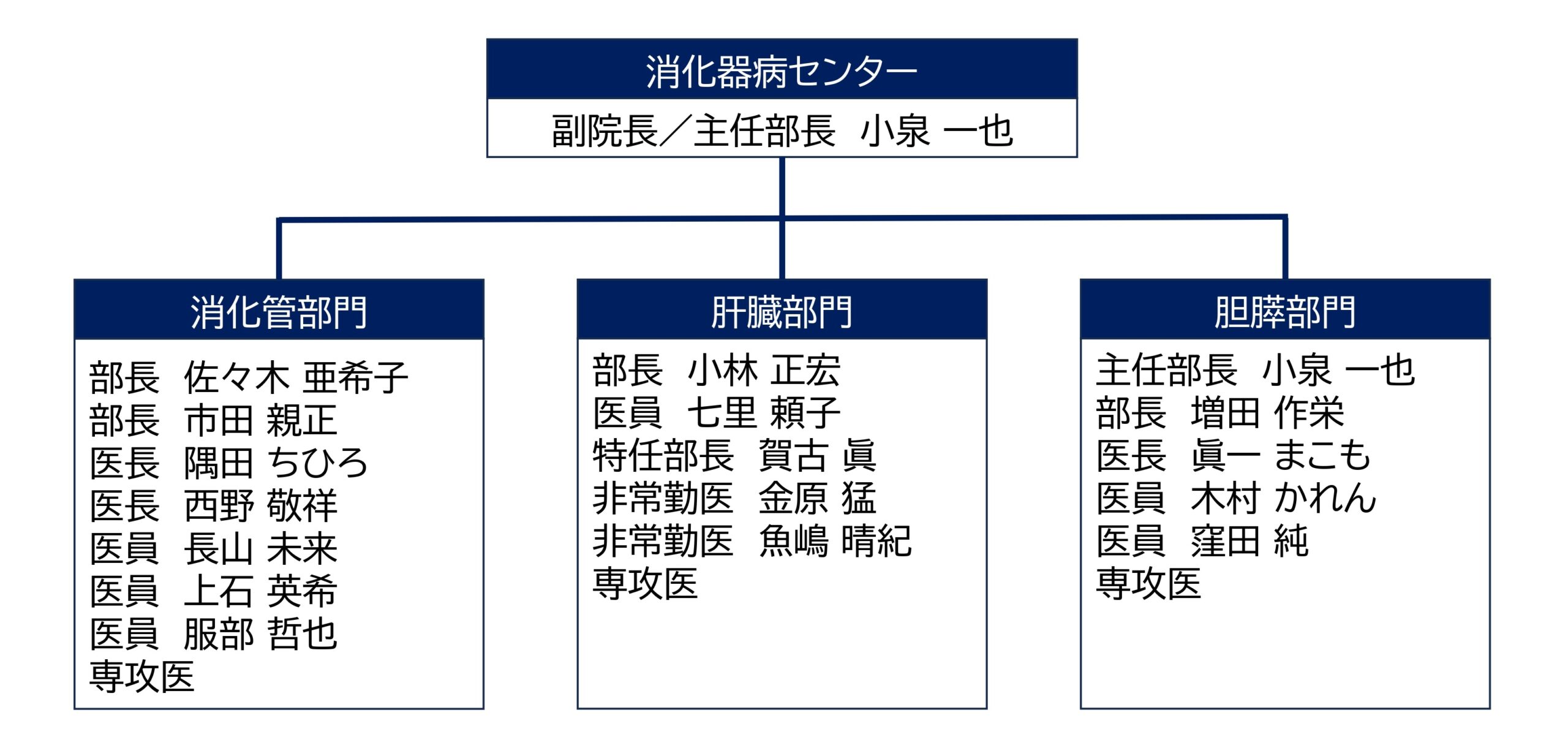 消化器病センターは従来の消化器内科とH21年に開設された肝胆膵疾患治療センターを統合し,消化管疾患、肝胆膵疾患を総合的に診断・治療することを目的にH25年4月に設立されました. 基本姿勢は365日24時間、消化管(胃、小腸、大腸)、肝臓、胆嚢、膵臓疾患の患者さんを対象に、患者さんに則した高度な医療を提供することであり、外科、救急部、IVRセンター、放射線科、オンコロジーセンター、総合内科と密に連携をとりつつ、患者さんに対して最善をつくすことを目標としております。