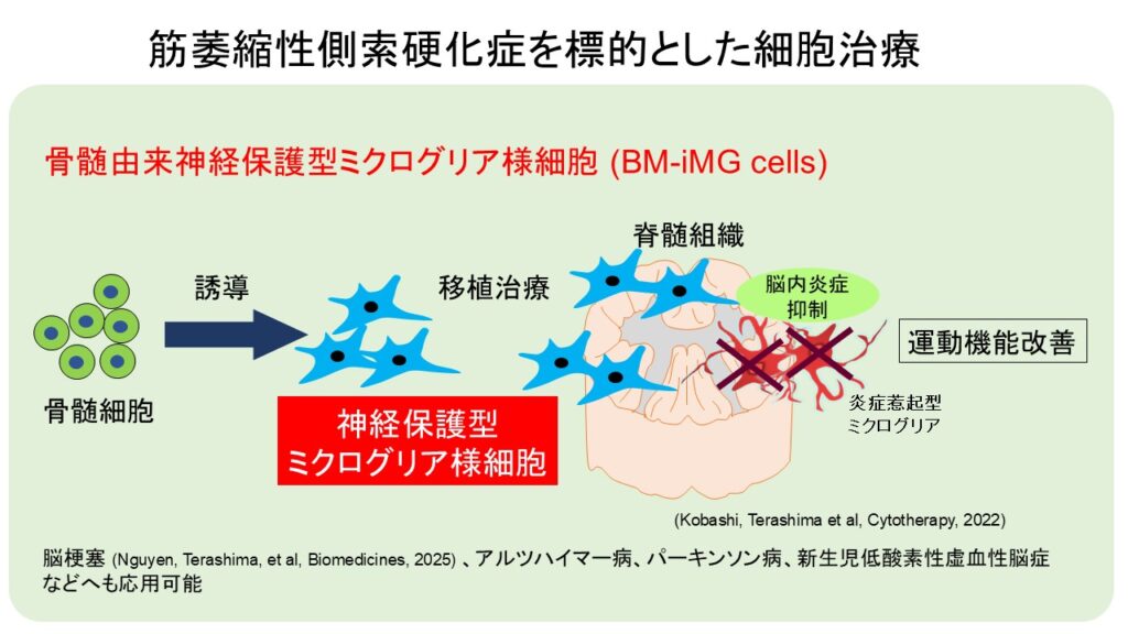 神経再生プロジェクトリーダーの寺島は、筋萎縮性側索硬化症(ALS)の再生治療を目指して、骨髄から神経保護型ミクログリア様細胞(BM-iMG cells)の誘導に成功し、ALSマウスの治療有効性を証明し論文報告(Cytotherapy, 2022)。また、このBM-iMG 細胞は、神経細胞を保護するため、慢性期脳梗塞マウスへの治療効果も認めた(Biomedicines, 2025)。この細胞は、骨髄から誘導できるため、自家移植可能であり、将来の臨床応用が期待される。