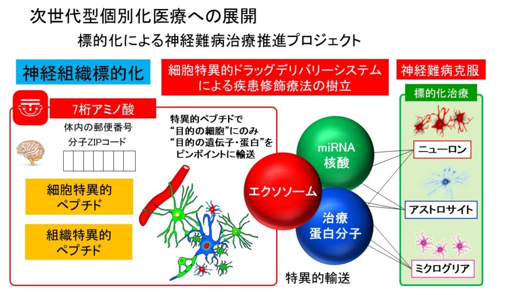 湘南先端医学研究所では、次世代型の分子治療法として、神経難病を標的とした特異的なドラッグデリバリーシステムの開発研究を行っている。神経組織は、様々な細胞(神経細胞、アストロサイト、ミクログリアなど)が相互にネットワークを構築していることから、遺伝子やペプチドなどの治療媒体を目的の細胞のみに選択的に運ぶ必要がある。そこで、当研究所では、細胞標的化ペプチドを用いたピンポイントな先端治療法の開発を行っている。筋萎縮性側索硬化症をはじめとする神経難病克服を目指す。