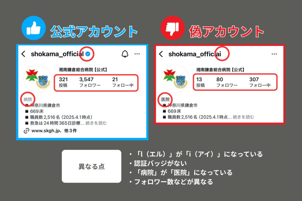 現在、湘南鎌倉総合病院の公式Instagramアカウントになりすました偽アカウントが確認されています。