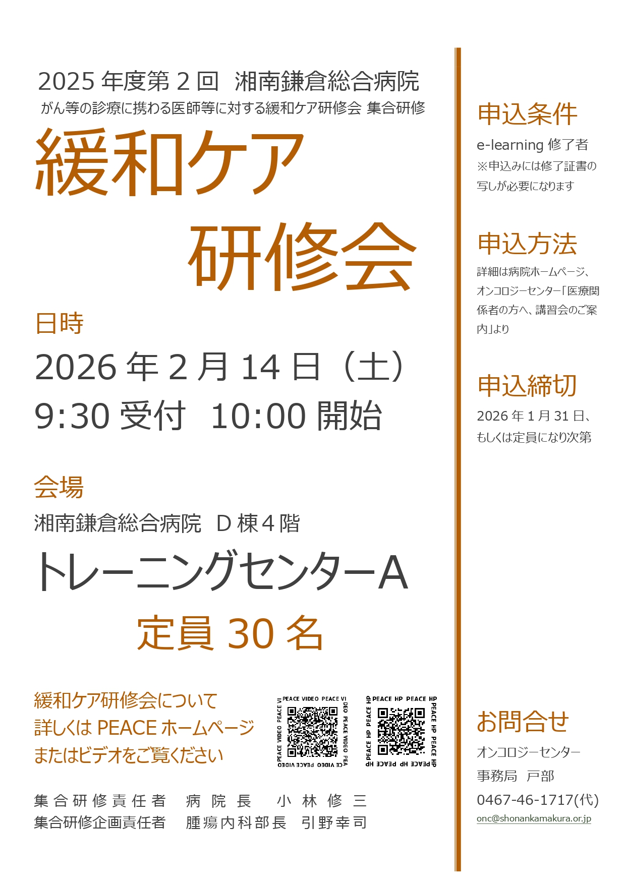 お申込み条件やお申込み方法は、オンコロジーセンター「医療関係者の方へ」から「講習会のご案内」をご覧ください。