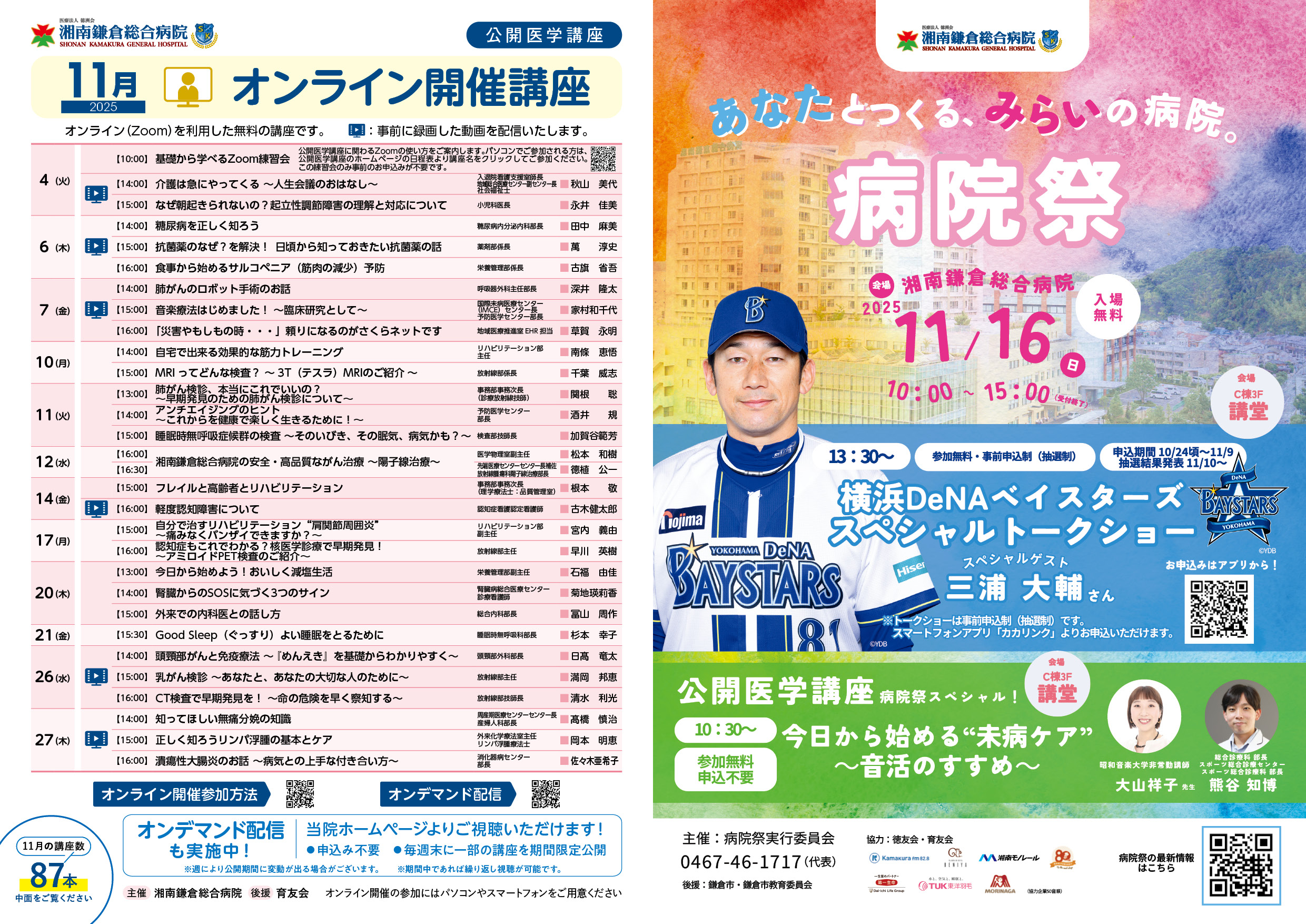 日々、医療現場で活躍する当院の医師、看護師、放射線技師、理学療法士、検査技師による会場(対面)またはオンライン(Zoom)でご参加いただける無料の医学講座です。