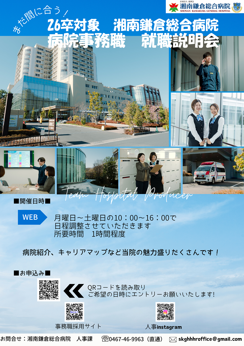 | 開催内容 | ①湘南鎌倉総合病院と病院事務職について ②採用情報について |